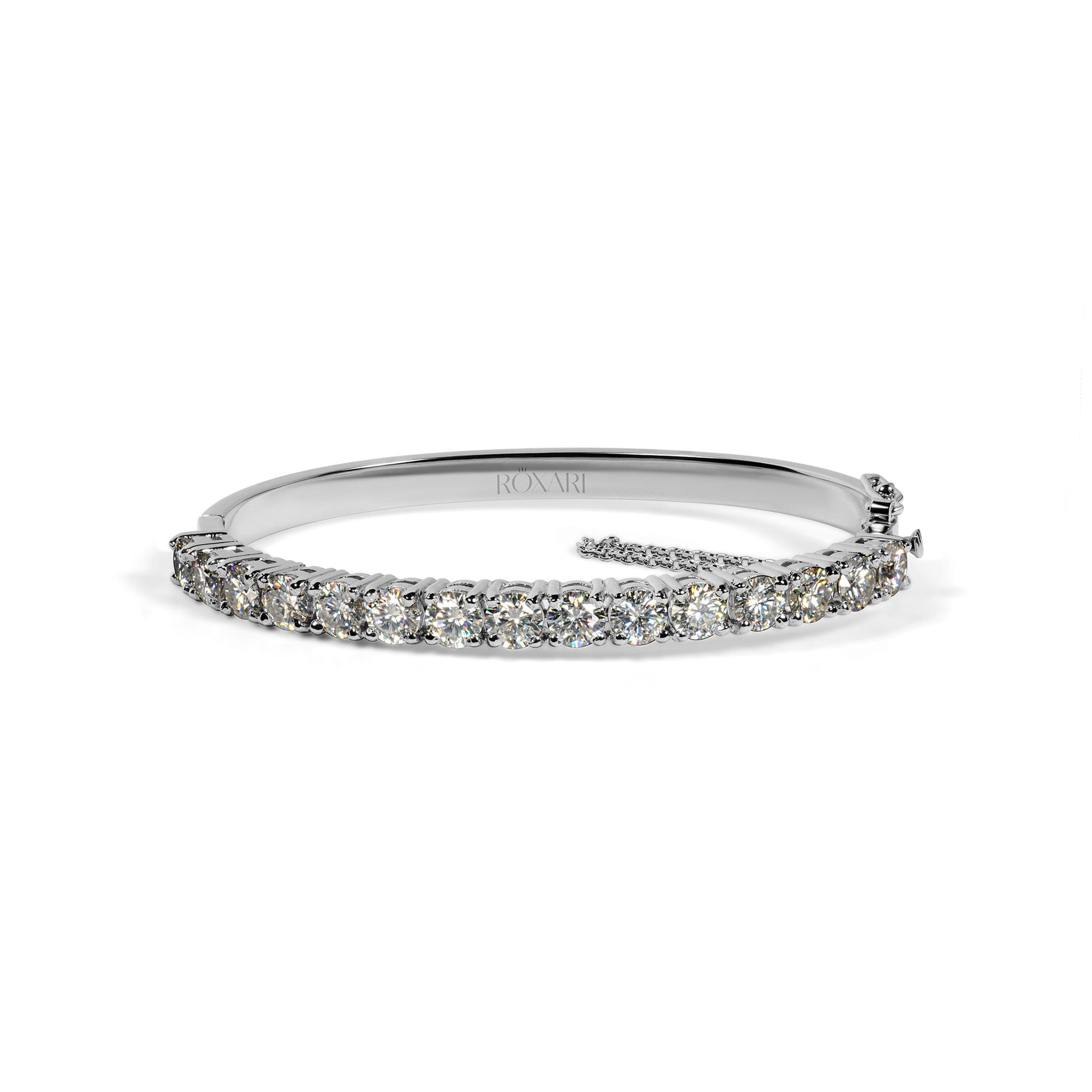 The Iconic Dazzle Bracelet is a 925 sterling silver bracelet for women in Pakistan, set with 15 round 0.5 carat moissanite stones (total 7.5 carats) for a full diamond-look sparkle. This elegant silver bracelet for women has a sleek bangle style with a secure clasp and delicate chain detail, making it perfect as a party wear bracelet, bridal bracelet design for mehndi or walima, or a luxury anniversary gift for her. Its moissanite stones give the brilliance of a diamond look bracelet at a more affordable price, making it an ideal choice for stylish ladies who want premium jewelry they can wear every day.