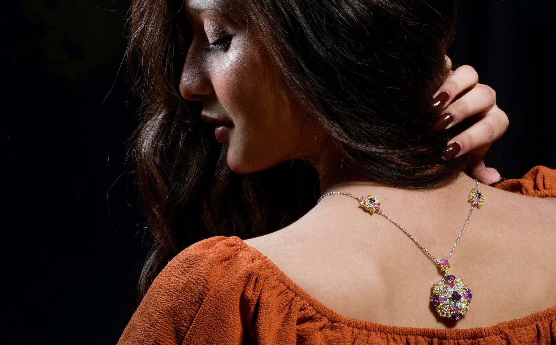 This handcrafted multi-gemstones pendant is a dazzling masterpiece. Natural Rubies, Amethysts, Peridot, Golden Topaz, and Swarovski cubic zirconia baguettes adorn the 925 sterling silver with Rhodium plating. The vibrant colors and sparkling brilliance make it a captivating accessory for any occasion.