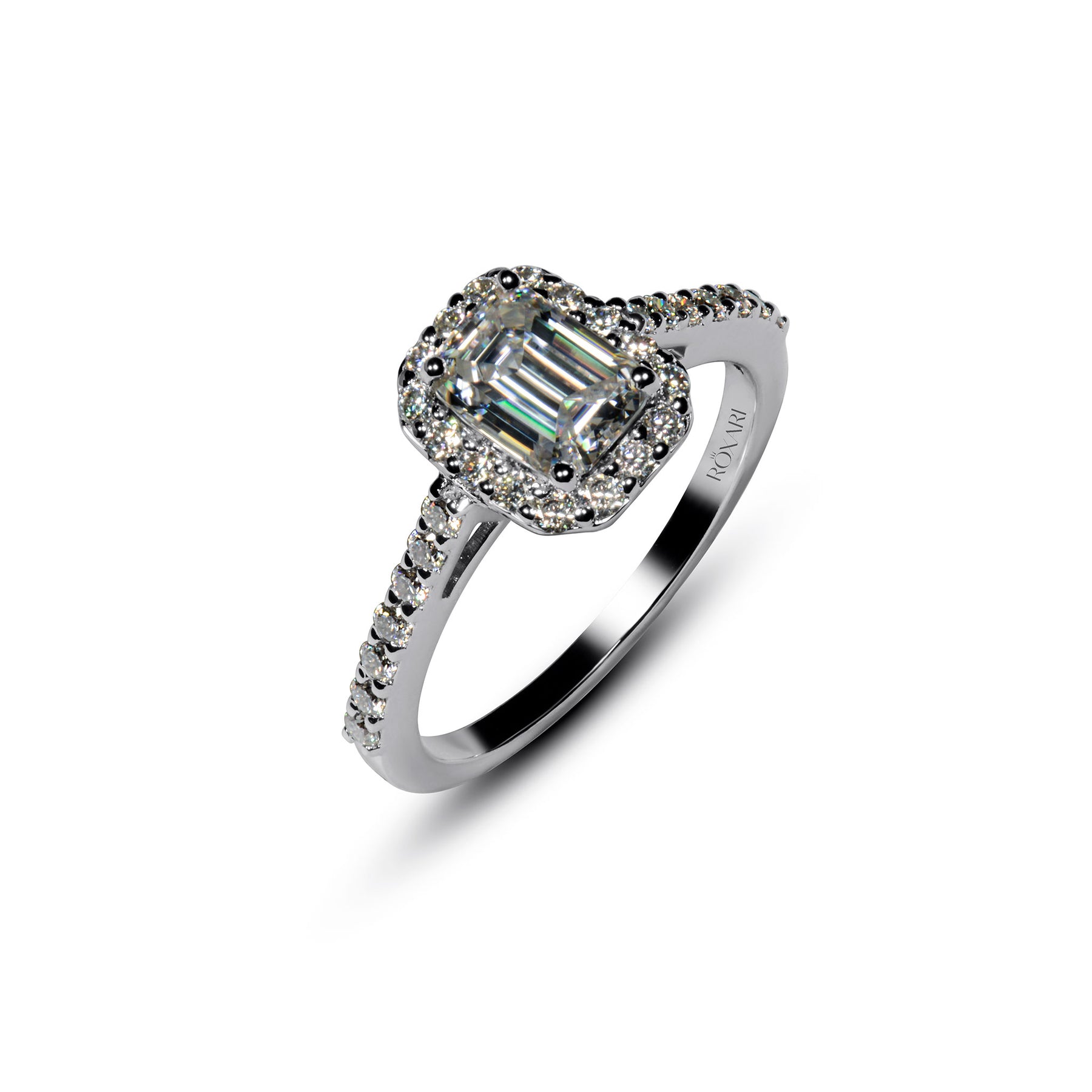 - Center Stone: 1 carat Emerald Cut Moissanite Diamond